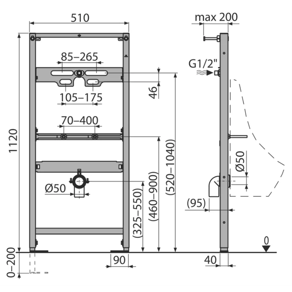 В комплекте: рама; монтажный комплект для крепления писсуара: болт m10 – 2 шт; монтажный комплект: винт ø8×60 – 4 шт.; дюбель ø12 – 4 шт ; колпаки для закрытия гаек ; стоковое колено ht50 с прокладкой ; резьбовое соединение для подключения воды: g1/2"–g1/2" ; самонесущий каркас с с-образным профилем. Приобретается отдельно: кнопка смыва.