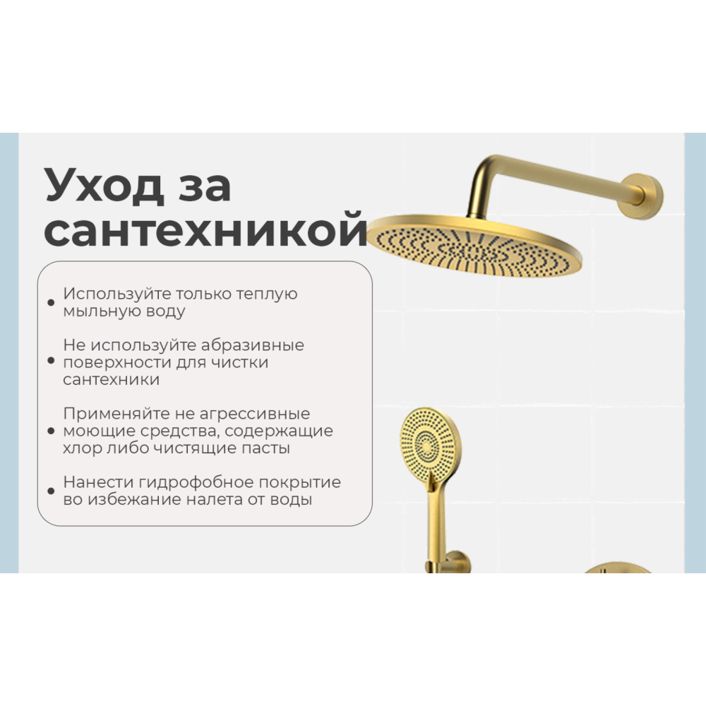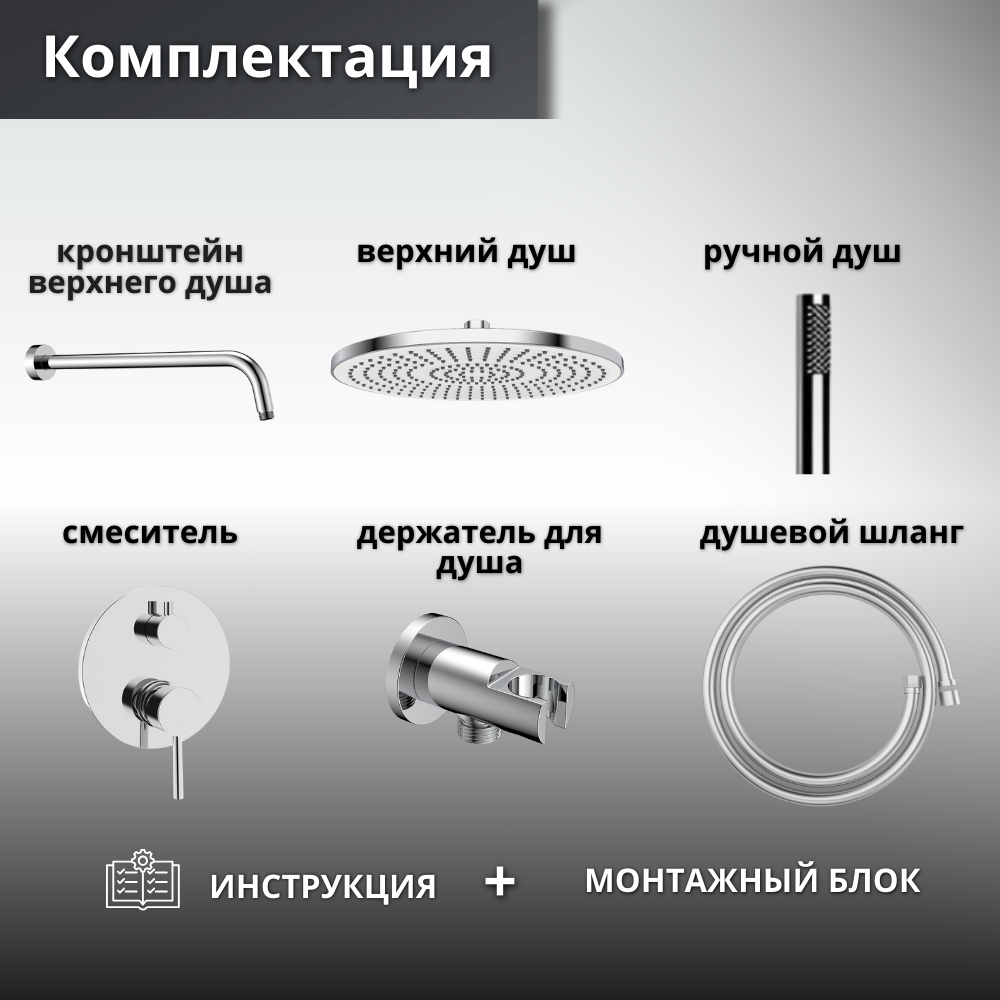 смеситель; монтажный блок; верхний душ; кронштейн верхнего душа; ручной душ; душевой шланг; настенный держатель; инструкция.