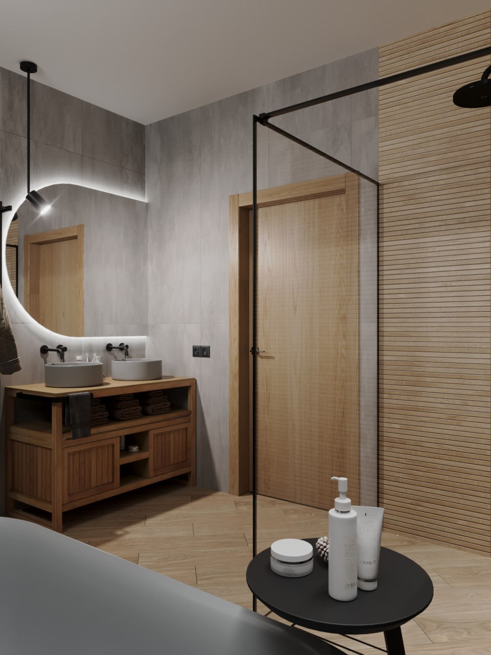 В этом проекте цветная сантехника от Аквамир прекрасно сочетается с текстурами бетона и дерева. Акриловая ванна AVS Сильва, подвесной унитаз Спектр и раковина AVS - все в благородном сером матовом цвете.