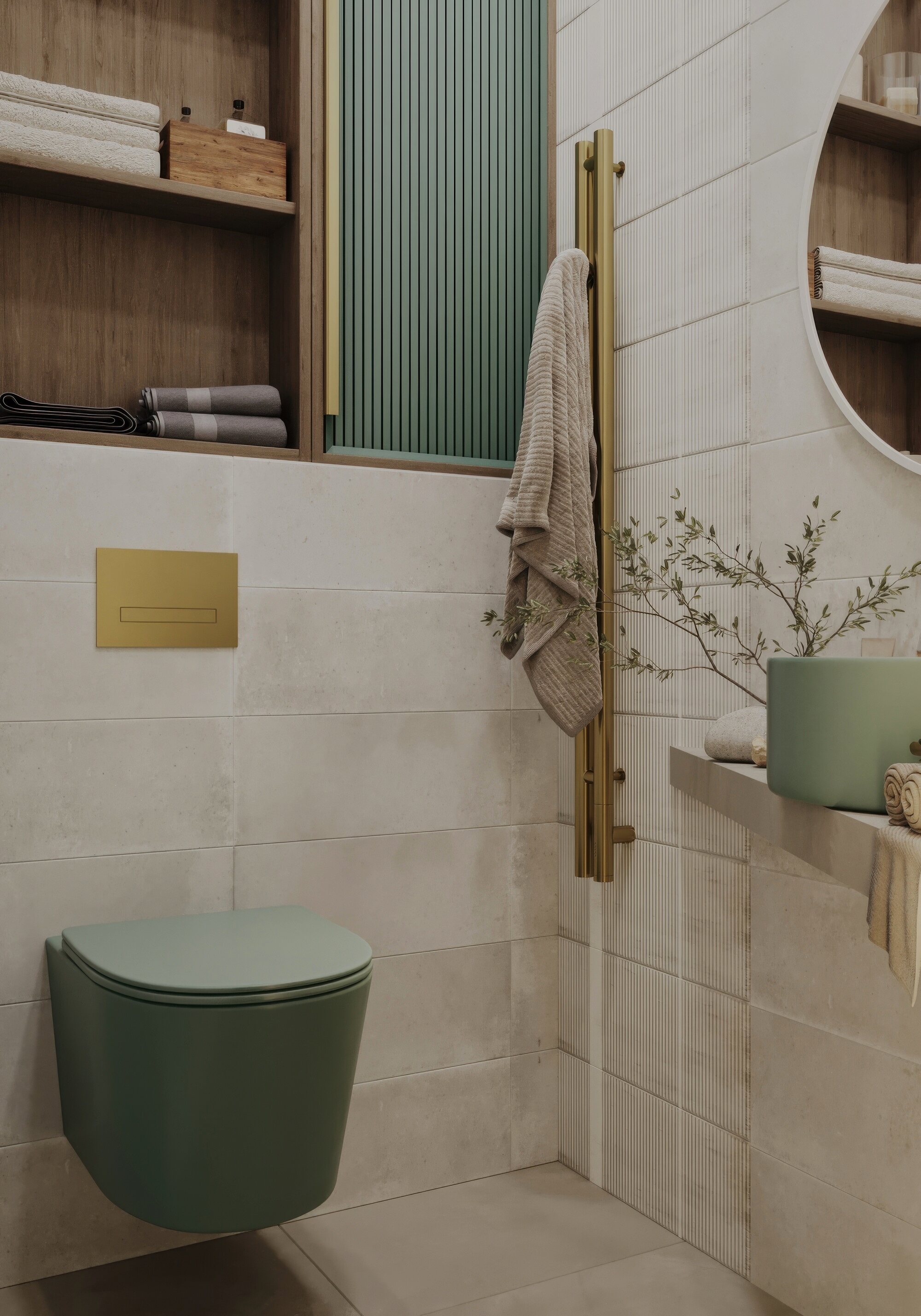 Функциональный санузел в трехкомнатной квартире ЖК «Сердце столицы», оформленный в стиле американской классики. Основной задачей было создать практичный и эстетичный интерьер, но без значительных затрат. В качестве ключевого акцента выбрана сантехника от Аквамира пастельного зеленого оттенка, который эффектно контрастирует с золотыми деталями: смесителем, кнопкой смыва и полотенцесушителем. Для оптимизации пространства спроектирована косая столешница, обеспечивающая удобное размещение сантехники и хранения. Компактный, но выразительный интерьер сочетает в себе продуманную эргономику и утонченную эстетику.