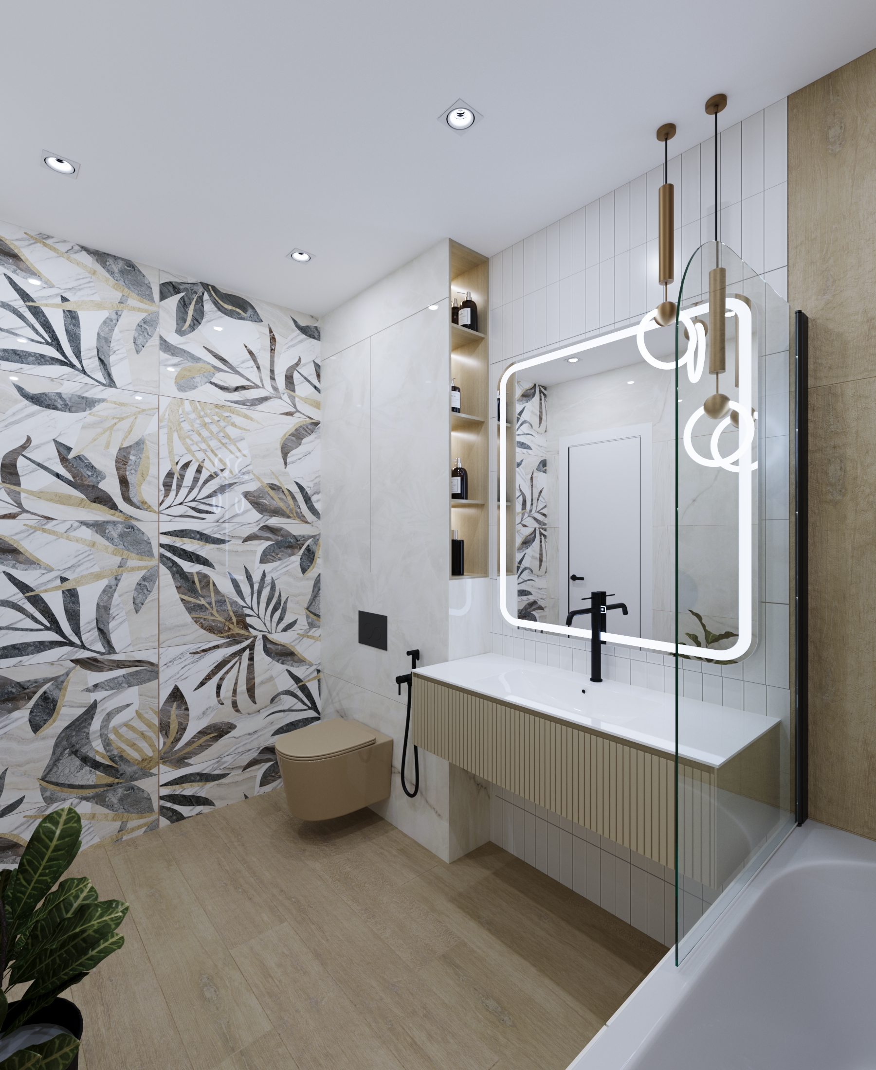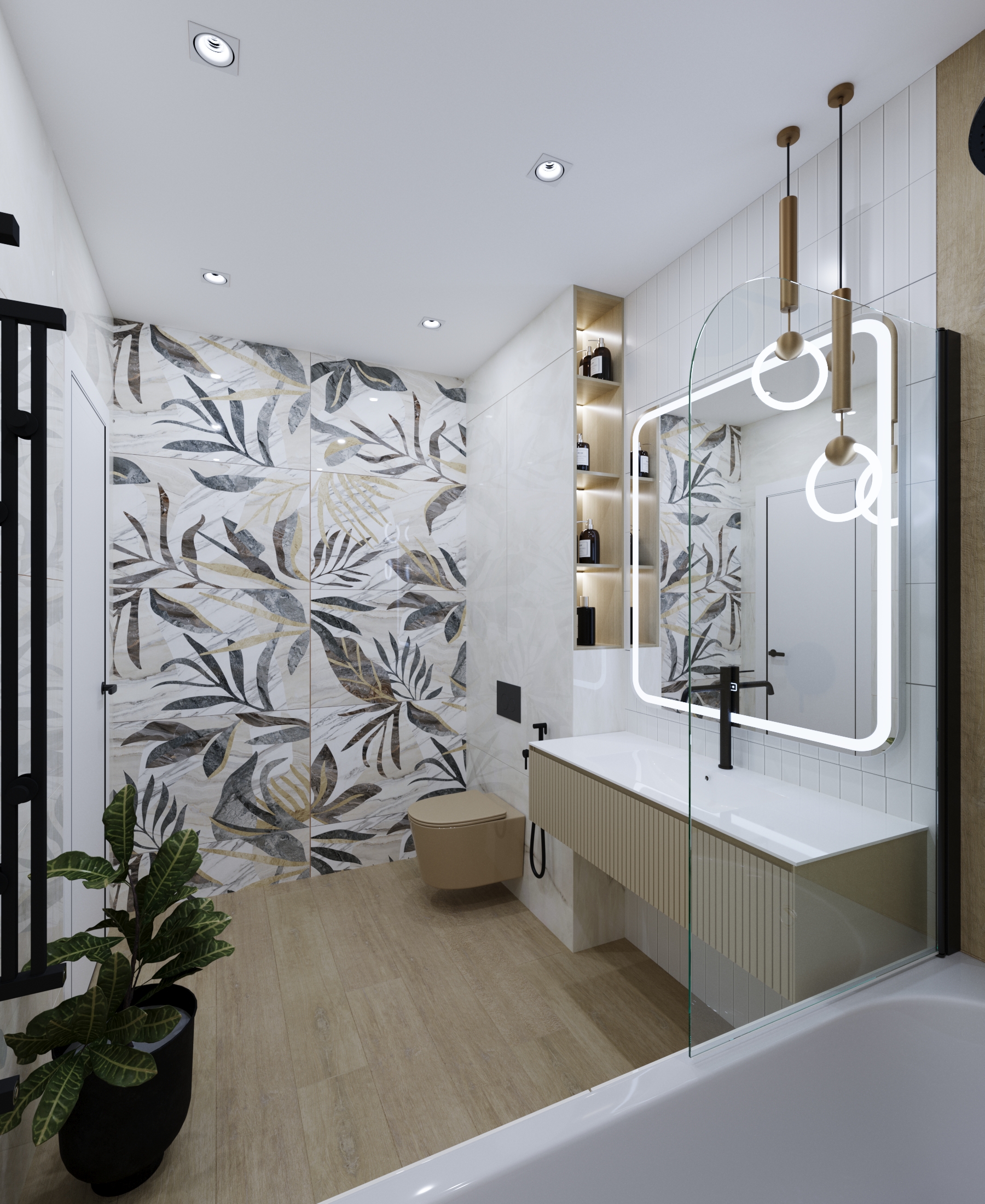 Оформлена в современном стиле для молодой семьи. Основной задачей было создать практичный, легкий и при этом светлый, красивый интерьер, но без значительных затрат. В качестве ключевого акцента выбран унитаз фирмы AVS пастельного оттенка, который эффектно контрастирует с черными деталями: смесителем, кнопкой смыва, душевой лейкой и полотенцесушителем. Для оптимизации пространства спроектирована ниша с полочками сбоку над инсталляцией, обеспечивающая удобное размещение принадлежностей для ванны. Современный выразительный интерьер сочетает в себе продуманную эргономику и утонченную эстетику.